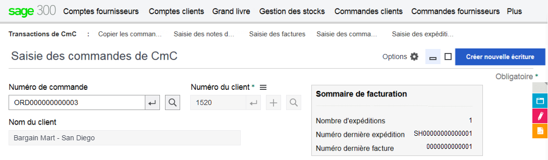Cette version inclut les nouveaux écrans web de Sage 300c suivants pour Commandes clients :